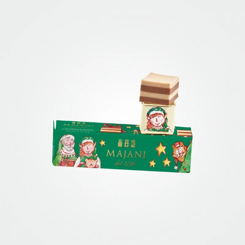 Vier klassische Cremini Fiat Würfel, je zwei Schichten aus Haselnuss und Mandelnougat. Im kleinen Etui mit festlichem Motiv. Auch die Würfel selbst sind in weihnachtliches Papier gewickelt. Eine köstliche, vegane und glutenfreie Aufmerksamkeit für alle Schokoladenliebhaber zur Weihnachtszeit.