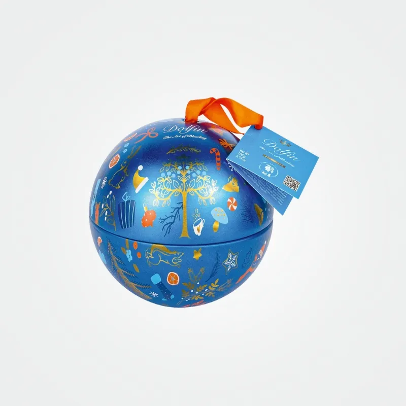 Die festliche Weihnachtskugel von Dolfin enthält zehn köstliche Minitafeln aus Vollmilchschokolade in fünf Sorten: pur, mit Karamell, Haselnuss, Kaffee und Spekulatius.